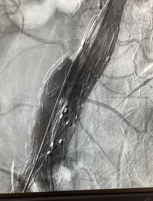 8月11日,欧阳长生为陈先生开展介入治疗,在DSA透视下反复确认支架主体释放位置后逐步释放支架系统,待左侧髂支完全释放后,再次经右侧髂动脉鞘管送入髂支分支支架,并精准于主动脉支架主体髂支衔接后稳定释放,最终实现主动脉瘤体的完全隔绝。术后造影显示瘤体完全封闭,双侧肾动脉及髂动脉血流未受到影响,手术顺利。因肾动脉血流未受影响,进一步提升了患者的生存质量。