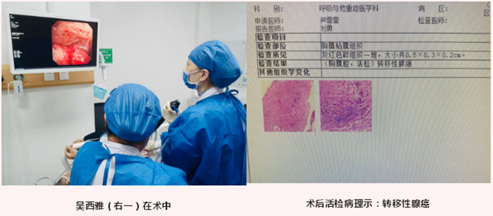 66岁男性患者,因反复胸腔积液、为进一步明确胸水病因,于2023年2月21日拟胸腔积液收入PCCM,肺部CT示:右侧大量胸腔积液。根据患者的病情,经吴西雅团队详细讨论,决定对该患者行内科胸腔镜检查术。在彩超的定位下、于腋中线第五肋间隙行1.2cm切口,钝性分离至胸膜层,置入胸腔置入器(Trocar),置入可弯曲电子胸腔镜,镜下可见胸腔内大量积液,吸引出1100毫升的血性胸水后,见壁层胸膜有弥漫性出血点及黄色斑点,脏层胸膜欠光滑。于壁层胸膜及脏层胸膜行多处活检。吴西雅顺利取得满意的病理标本。
