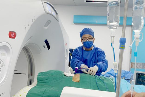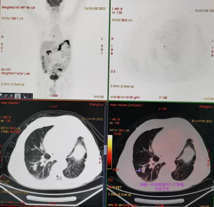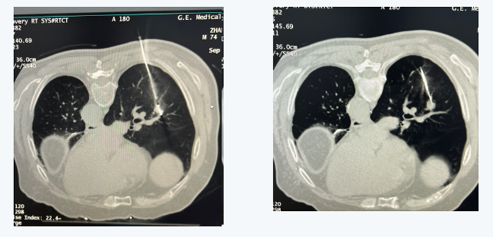 经了解,曾麟团队有丰富的经皮穿刺活检经验,至今已成功进行上千例各种高难度穿刺活检,故张先生慕名来我院就诊,经过仔细阅片及团队多次讨论后,曾麟在CT引导下行经皮穿刺,在毫厘之间避开数根肺内血管,一针到位,成功取到病理组织,最终病理结果证实是肺腺癌。根据患者病情为其采用经皮微波消融术,该手术创伤小,时间短,手术前后不到20分钟,张先生当晚即可下地行走,术后5天出院。在术后一个月复查时,PET-CT显示整个术区肿瘤活性完全消除,达到局部根治的效果,张先生和他的家属非常满意。