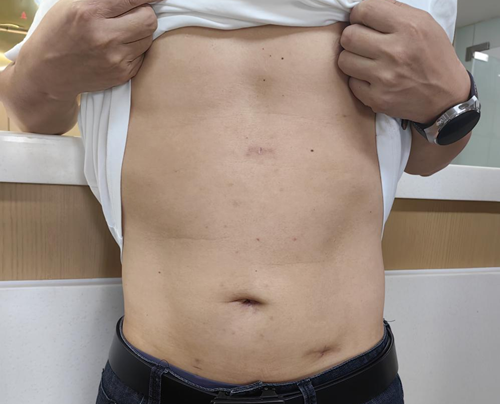龚先生发现糖尿病已有8年,原来靠服用降糖药来控制血糖,但血糖控制不佳,空腹血糖10mmol/L左右,餐后18mmol/L左右,糖化血红蛋白8.9%,甘油三酯10.3mmol/L,胆固醇6.94mmol/L,各项指标都超标,严重影响生活质量。本着根除病痛的决心,龚先生慕名来我院行糖尿病手术。手术团队经过术前多学科评估,2023年4月24日胃肠廖传文主任团队为其完成了糖尿病腹腔镜外科手术——腹腔镜下空回肠旁路术。手术非常顺利,耗时50分钟,微创完成。术后运用ERAS理念,制定了个性化糖尿病患者围手术期的治疗方案。龚先生术后第1天即下床活动,进流质饮食;术后第4天出院。住院期间血糖就出现好转。出院后逐步停用口服降糖药,一月左右完全停用。血糖控制非常好,而且无任何不良反应,腹部也几乎看不到切口瘢痕,出乎了他的预料。