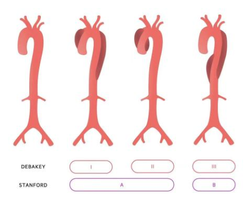 根据破口位置和夹层累及范围分型可分DeBakey分型和Standford分型,Standford分型分为A型和B型,Standford A型是指破口位于升主动脉,夹层累及范围自升主动脉到降主动脉甚至腹主动脉。