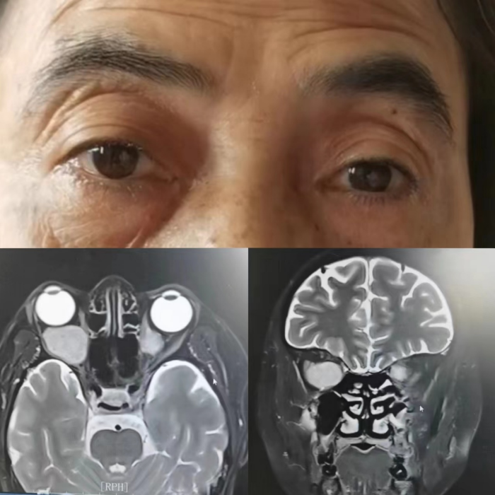 患者朱某,因发现双眼眼眶肿物10余年入院。查体显示右眼眼球突出,双眼眼球突出度:16-97mm-10.5,右眼内转位,右眼外转稍受限-1,磁共振显示:双眼海绵状血管瘤可能,右眼肿瘤较大,与视神经关系密切,图像显示视神经包绕。手术风险较大,手术过程中若牵拉视神经,就有失明的风险。