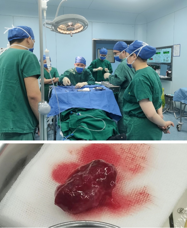 手术相对复杂,金涵团队与肖满意经过仔细阅片及病情评估,最后决定在全麻下行右眼外侧开眶探查+眶内大肿物取出术。手术紧罗密布进行中,手术顺利,完整取出35mm*28mm大小血管瘤样肿物。