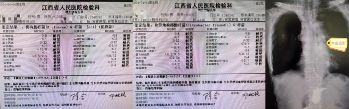 图3 患者术后痰培养证实存在肺部感染(左侧报告),术后一周造影显示吻合口顺利愈合