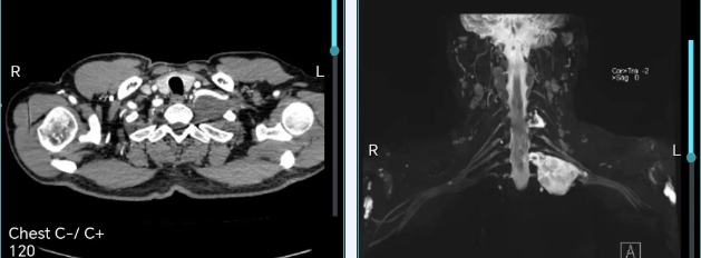 该患者是一名54岁男性,因“检查发现纵隔肿物1周”入院。无咳嗽、咳痰、胸闷、声音嘶哑、肢体麻木疼痛等伴随症状。既往有高血压病史。入院检查发现,患者肿瘤位置刁钻,位于左侧胸廓入口处,周围有多根重要神经血管穿行,稍有不慎,伤及血管则大出血,伤及迷走神经喉返神经易导致声音嘶哑,伤及脊神经根、臂丛神经等则会出现肢体活动障碍,左上肢残废。因此,胸外科主任徐全团队为该患者精心制定诊疗方案,争取一方面根除肿瘤,一方面力保功能。