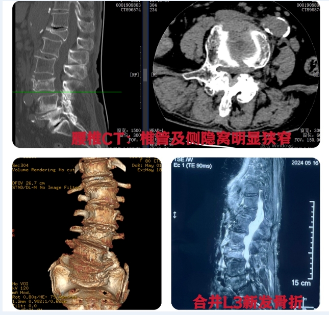81岁的黄奶奶1年前开始出现行走后右下肢疼痛,当时并未引起重视,导致疼痛症状越来越重,走几步就酸胀难忍,生活无法自理。半个月前扭到腰后更是出现剧烈腰痛,情况更是雪上加霜。5月17日,黄奶奶在家属的陪同下辗转到江西省人民医院(南昌医学院第一附属医院)骨科一区办理了住院。主任医师肖强接诊后发现患者整个腰椎明显变形,脊柱侧弯合并严重退变增生,容纳神经的结构已变得非常狭窄,这是导致她大腿疼痛的罪魁祸首;同时,黄奶奶合并严重骨质疏松导致腰椎(L3)新发骨折,这是导致她近期出现的严重腰痛主要原因。